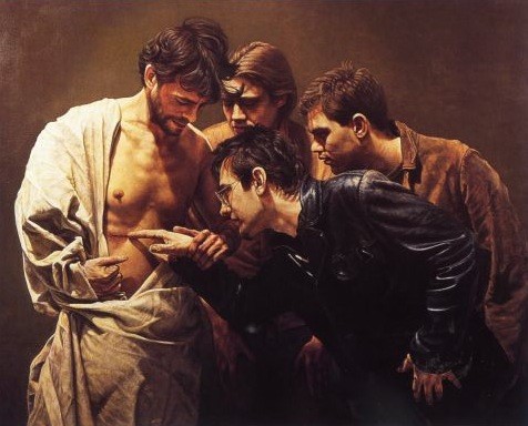 A másik kép ennek a Caravaggio képnek az újragondolása, mai alakokkal, egy welsi székesegyházban látható: John Granville Gregory' festménye, „még mindig kételkedünk” címmel.