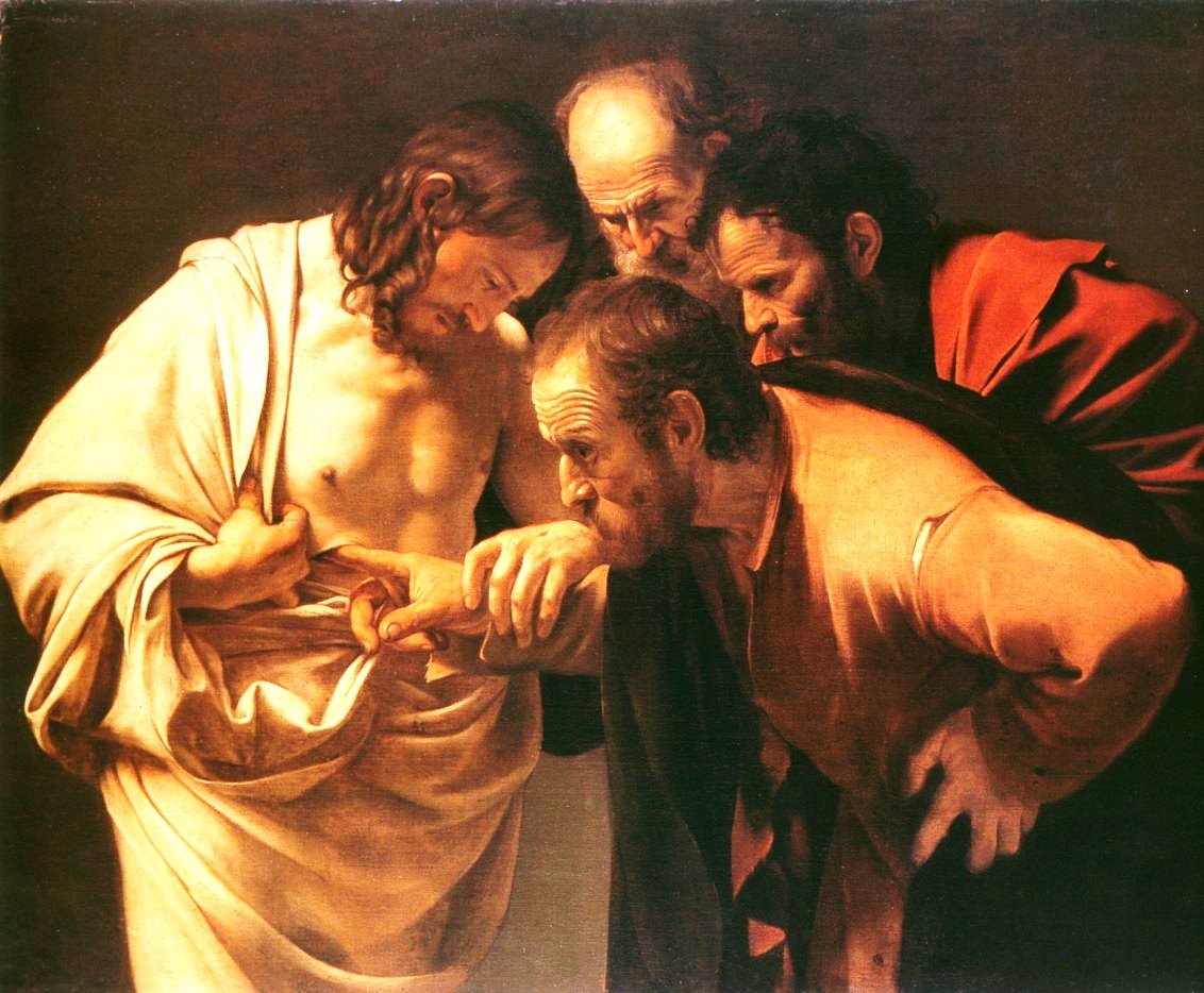 Két képet hoztam most nektek: Caravaggio híres festményét a kételkedő Tamásról, amint ujját mélyen a Jézus oldalán lévő sebbe helyezi. Nem a bőrfelület óvatos érintése ez, hanem egy annál erőteljesebb mozdulat. Jézus arcán nem tükröződik fájdalom, mégis azt érezzük, hogy fáj neki Tamás hitetlensége. Fáj neki, hogy egyik apostola nem akart hinni társainak, és kételkedett abban, hogy ő valóban feltámadt és megjelent nekik. És ebben a helyzetben Jézus akar gyógyítani. Ő, a megsebzett, a keresztre feszített akar gyógyítani. Ő, akinek szívét lándzsával döfték át, most gyógyítani akarja Tamás hitetlenségét. Megengedi, hogy az apostol megérintse sebét, hogy ez a tapasztalat végképp eloszlassa minden kételkedését.