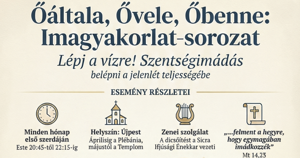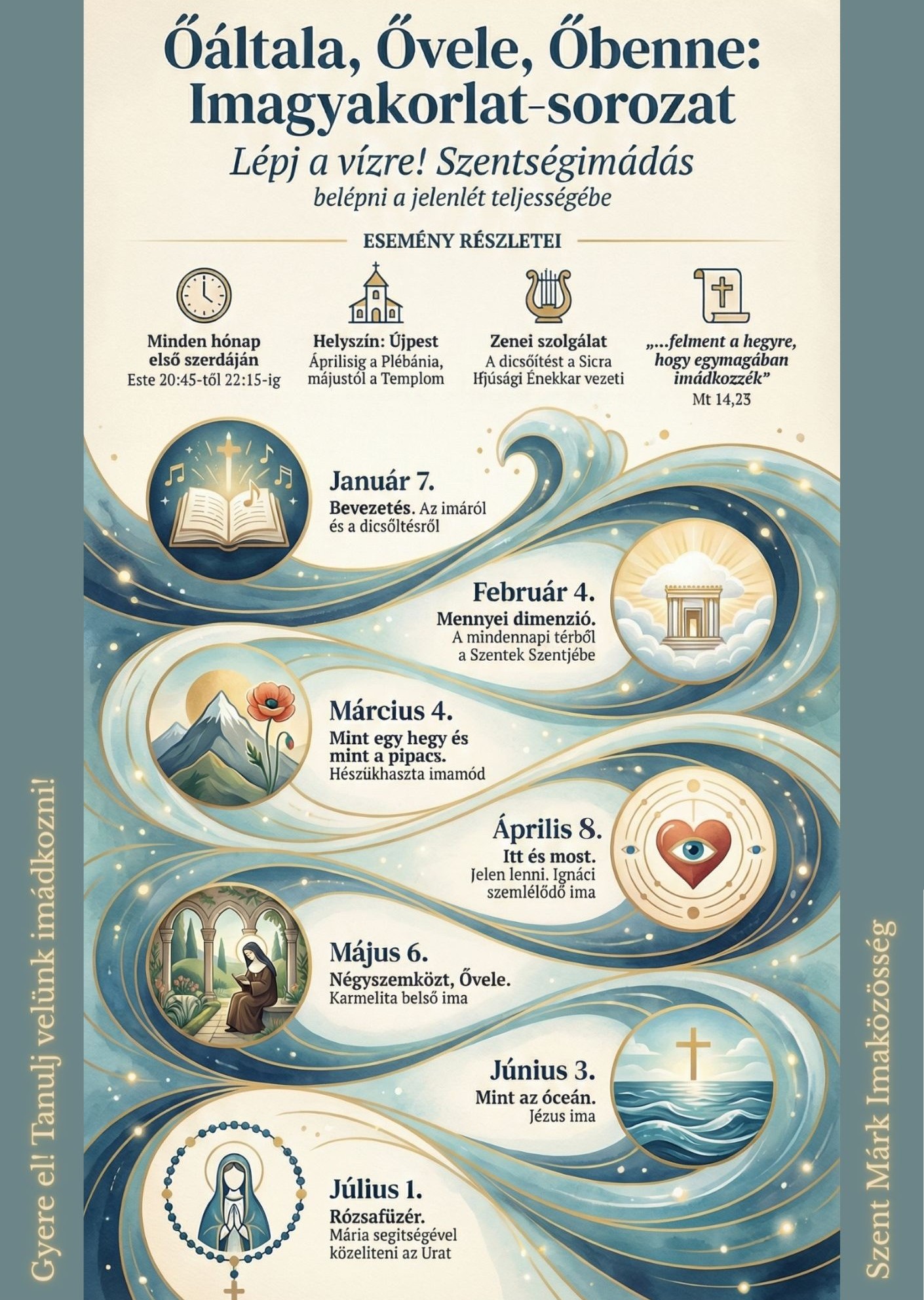 2026 januártól júliusig 7 alkalomból álló imagyakorlat-sorozat a Lépj a vízre! Szentségimádás keretében a Szent Márk Imaközösség szervezésében.