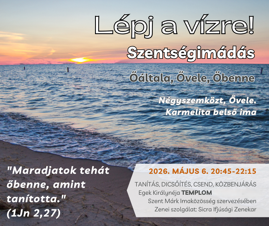 A Szent Márk Imaközösséggel szeretettel hívunk benneteket Lépj a vízre! Szentségimádásunkra május 6-án, mely imagyakorlat-sorozatunk ötödik alkalma lesz.